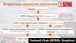 Ланцюжок підприємств, з якими пов'язані кримські магазини Фоззі Груп, досить широкий: їх шість. Це, наприклад, «Торговий дім «Ніжин», зареєстрований у Київській області, і «Ніжинський консервний завод» з міста Ніжин Черкаської області, який виробляє плодоовочеву продукцію (соління, соки, соуси) під відомою торговою маркою «Ніжин».