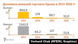 Найбільш масштабний рівень падіння зафіксований у зовнішній торгівлі півострова. Так, за підсумками січня-листопада 2016 року зовнішньоторговельний оборот Криму склав лише 65,8 млн дол США ‒ в 3 з гаком рази менше рівня 2015 року (216,7 млн дол.). Якщо порівнювати з часами до російської анексії півострова, кримський експорт скоротився приблизно в 28 разів, а імпорт ‒ в 35 разів.