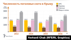 Не залишає росіянам приводу для радості і сфера тваринництва. Так, виробництво великої рогатої худоби продовжує скорочуватися: з 158,2 у 2013 році до 114,7 тис голів у 2016 році (на 28%), корів ‒ з 69,8 до 62 тис. голів (на 12%), свиней ‒ з 164,1 до 152,1 тис. голів (на 8%), овець і кіз ‒ з 282 до 227,6 тис. голів (на 20%).