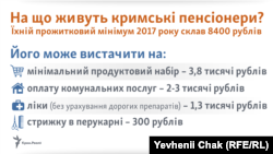 Отже, щонайменше 3,8 тисячі рублів кримський пенсіонер витрачає на купівлю продуктового набору. Ще в 2-3 тисячі рублів йому обійдеться оплата комунальних послуг. Про розцінки Крим.Реалії писали раніше.