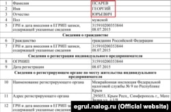 Свідоцтво видане в липні 2015 року інспекцією федеральної податкової служби в Сімферополі, де з 2010 року проживав Псарьов, коли приїхав на роботу до кримського уряду. Згідно з документом, підприємцю дозволено займатися морськими перевезеннями, зокрема й вантажними, торгівлею, орендою нерухомості та земельними оборудками. Але чи належить цей документ екс-віце-прем'єру Криму, достовірно не відомо. З'ясувати це в самого власника не вдалося, його контактних даних у відкритому доступі немає.