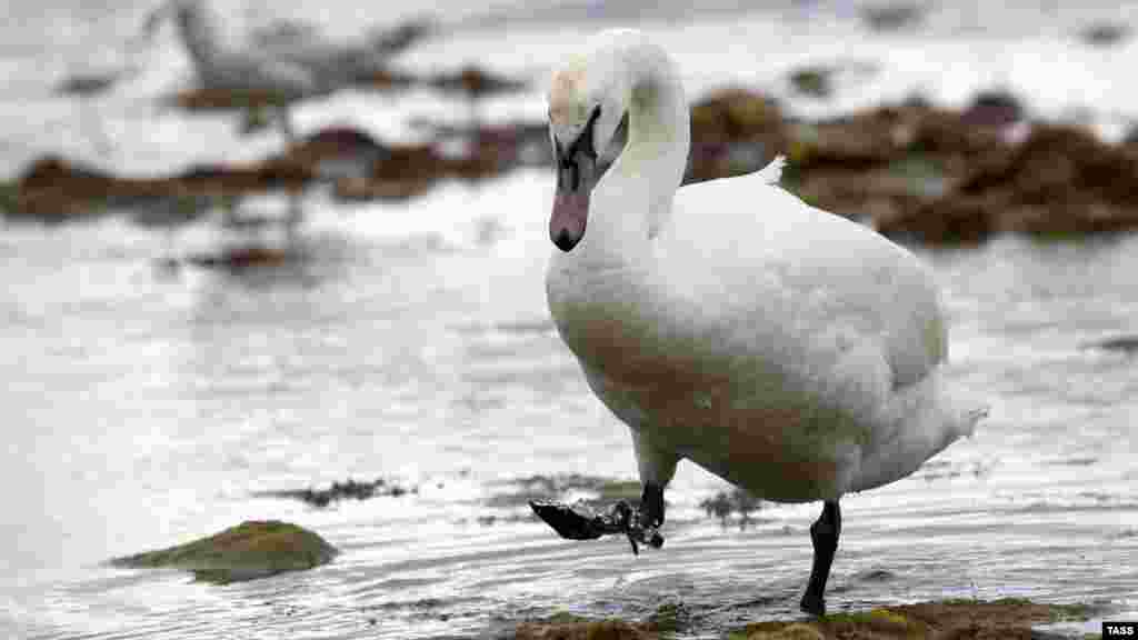 Берегом Каламітської затоки, що омиває Євпаторію з півдня, крокує білий лебідь