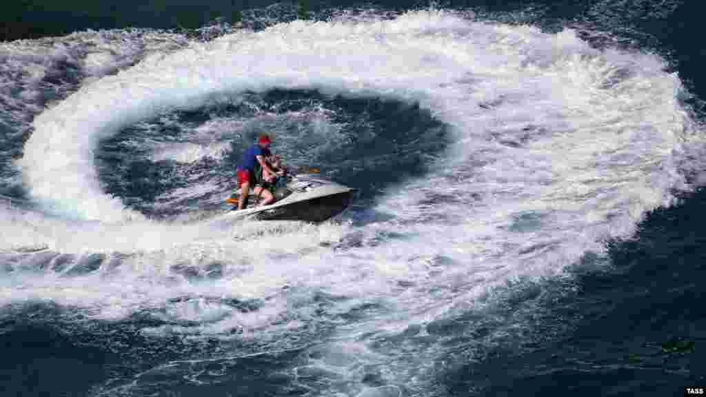 Чоловік і жінка «хвилюють море», катаючись на гідроциклі біля скелі Діва в селищі Сімеїз.