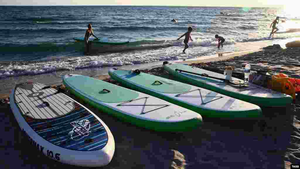 Дошки для сапсерфінгу на пляжі в селі Поповка (Сакський район) очікують любителів літніх водних видів спорту.