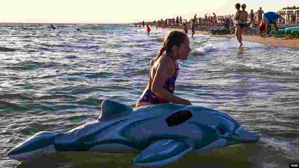 Дівчинка з надувним дельфіном на пляжі в селі Поповка | Кримське фото дня