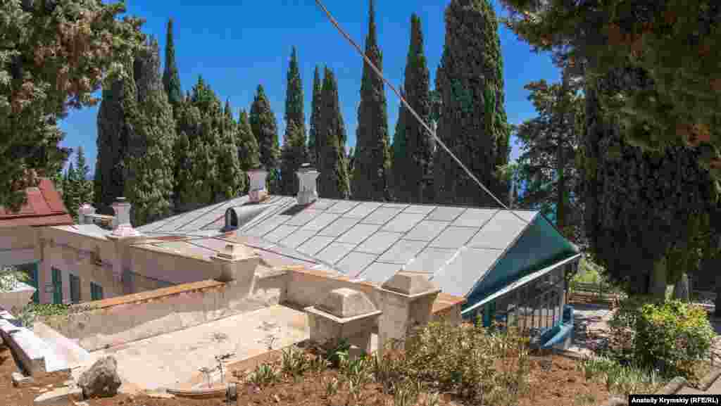 Корпус одного з санаторіїв Професорського куточка, що межує з територією садиби Шмельова, в щільному кільці кипарисів