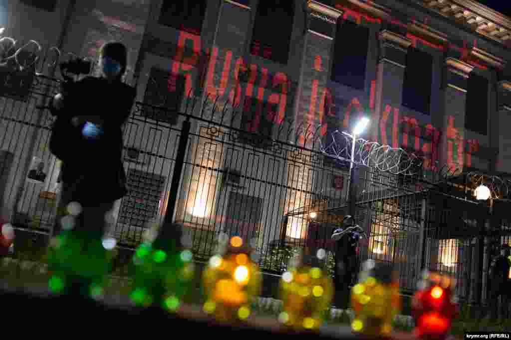 Активісти закликали припинити анексію Криму, розгорнули державний прапор України і національний прапор кримських татар, запалили лампади і проектували на будівлю посольства різні зображення.