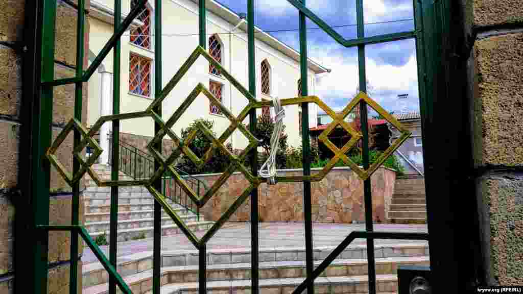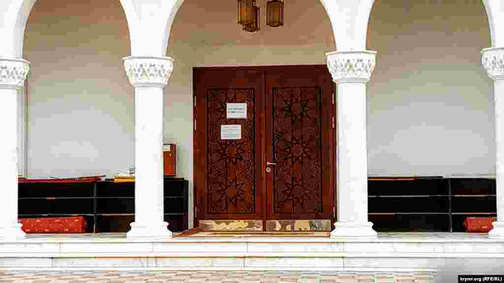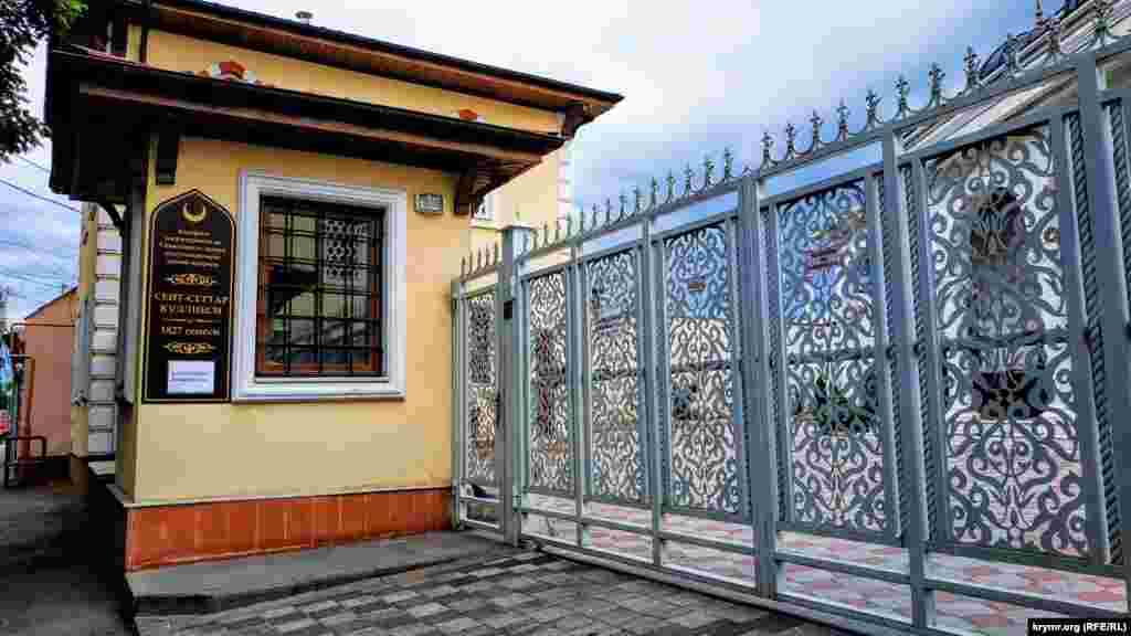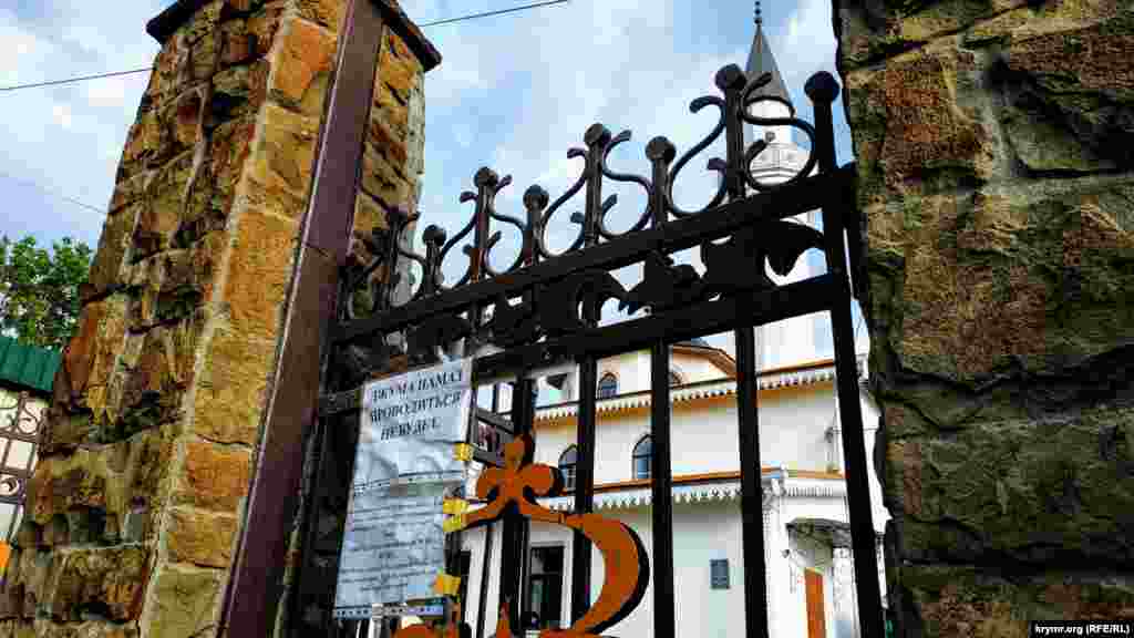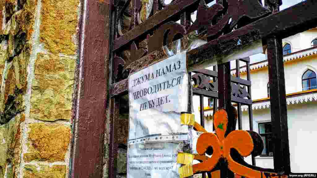 Табличка із закликом також розміщена на воротах перед мечеттю Аджи-Сеїт-Нафе в центрі Сімферополя
