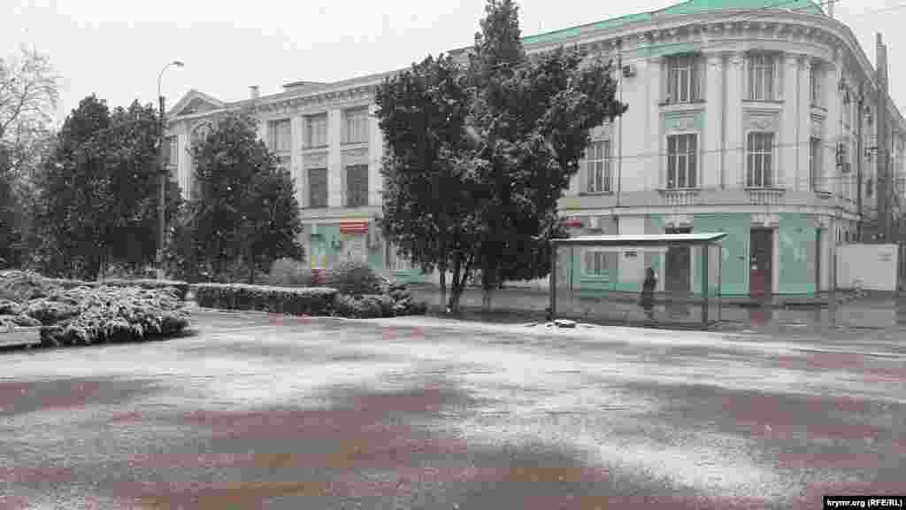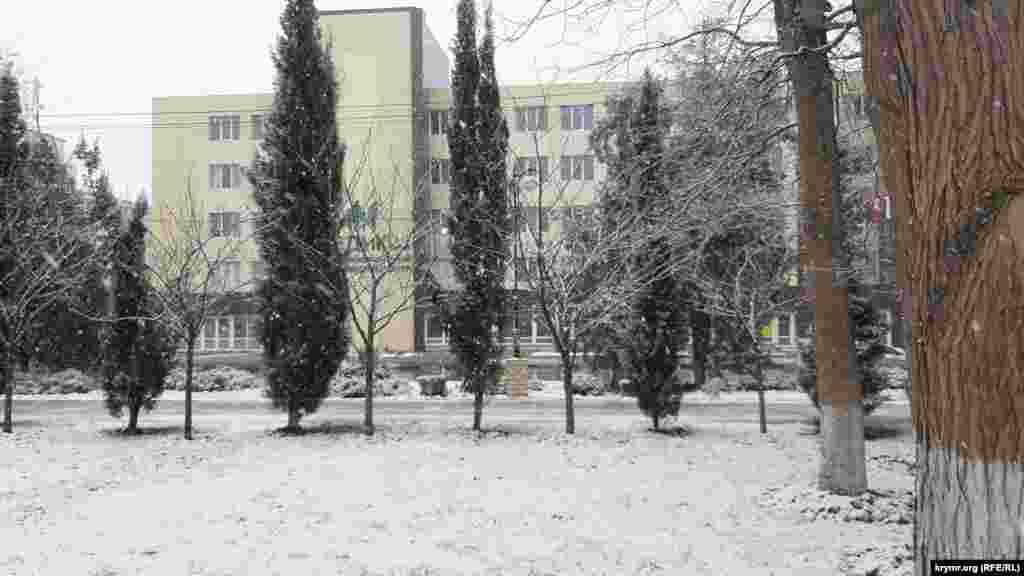 У центрі Керчі – на центральній вулиці Кірова, в сквері біля міської ради, практично немає перехожих. Одинокий двірник чистить доріжки, а сніг продовжує падати.