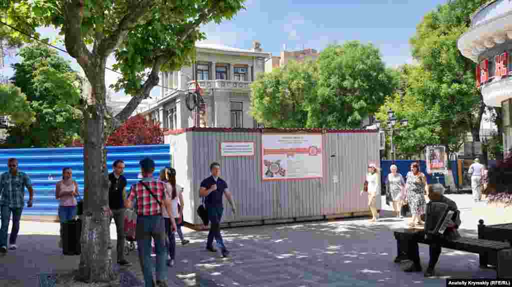 Рух на вулиці Пушкіна в центрі Сімферополя заблоковано новим будівельним парканом. Ще на початку квітня на перетині вулиць Горького і Гоголя почали знімати дорожнє покриття та тротуарну плитку для заміни комунікацій. Знесенню підлягають старі ліхтарні стовпи часів Австро-Угорщини, і деякі аварійні дерева.